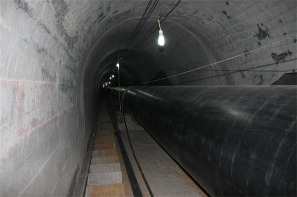 2006年該段管道進(jìn)行了漏磁檢測,管道狀況良好。2013年9月對該隧道抽水后進(jìn)行了管道狀況的直接檢查,檢查重點(diǎn)集中于以下4個(gè)方面:一是隧道內管卡錨固系統腐蝕情況;二是隧道內管道的補口質(zhì)量;三是隧道內管道三層PE外涂層質(zhì)量;四是隧道內管道的陰極保護情況。本次隧道打開(kāi)檢查工程共抽水37 050 m3,歷時(shí)57天,抽水后隧道情況見(jiàn)圖1。