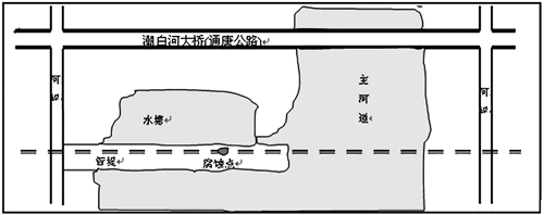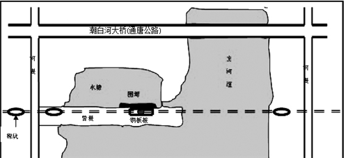 潮白河穿越管段與通唐公路(潮白河大橋) 平行間距80m,河道內管道東側有管堤180m,其余200多米為主河道,主河道內及管堤兩側常年有水。管堤寬11m,管道位于管堤南側3.5m處,腐蝕點(diǎn)位于管堤156m處, 管堤南側是一個(gè)長(cháng)140m、寬50m的水塘,水深約2.5m(圖2)。