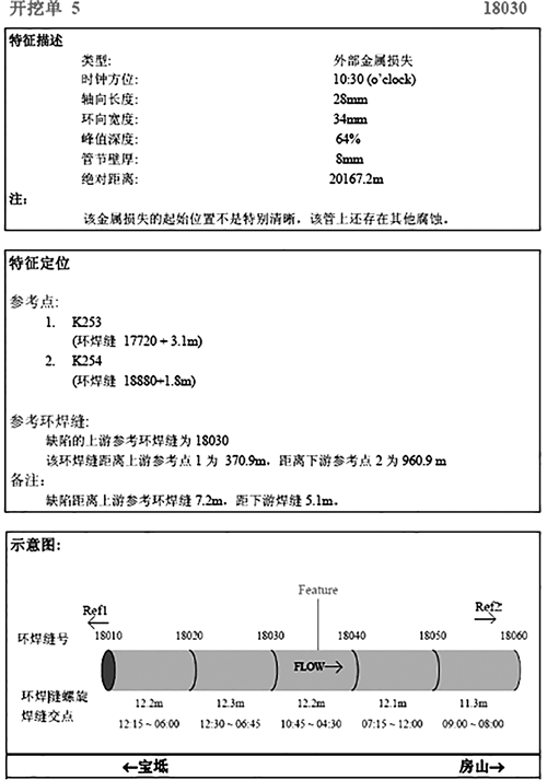 管道缺陷腐蝕點(diǎn)的位置,一般是根據管道缺陷修復開(kāi)挖單所給定的地面標記點(diǎn),準確測量參考環(huán)焊縫的位置(圖4),再依據實(shí)際開(kāi)挖時(shí)數據偏差來(lái)確定。