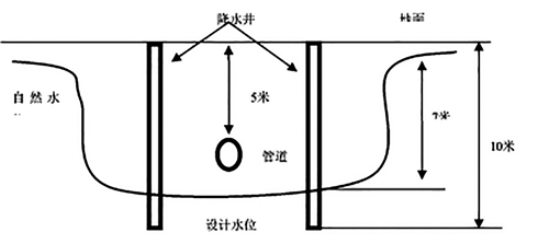 依據相關(guān)技術(shù)規范,結合巖土工程勘察報告,根據經(jīng)濟、合理、安全的原則,沿管道腐蝕缺陷修復作業(yè)坑均勻布設降水井14個(gè)(圖-7), 降水采用直徑400的水泥管井,井深10m(圖-8),保證穩定水位降到輸油管道2m以下。