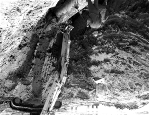 管道腐蝕缺陷修復作業(yè)坑以腐蝕點(diǎn)為中心, 向兩側各延伸15m-20m,作業(yè)坑挖深至套管底部0.5m,該段管道埋深5m(根據雷迪探測),作業(yè)坑挖掘深度為6m-7 m,長(cháng)40m,寬6m。土方挖掘采用機械開(kāi)挖,現場(chǎng)設專(zhuān)人指揮(圖9)。作業(yè)坑坡頂嚴禁堆物及附加荷載。作業(yè)坑一次成型,且作業(yè)坑內無(wú)水,為管道缺陷修復創(chuàng )造了良好的條件。