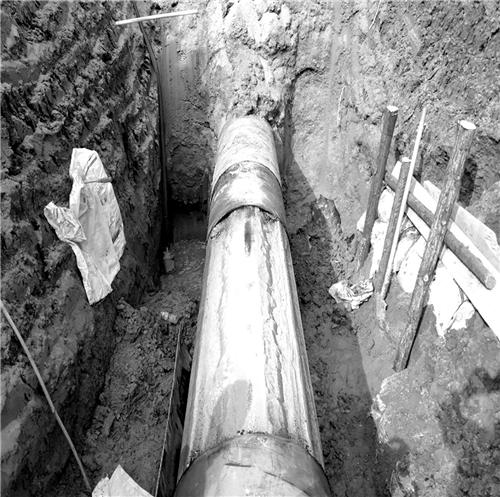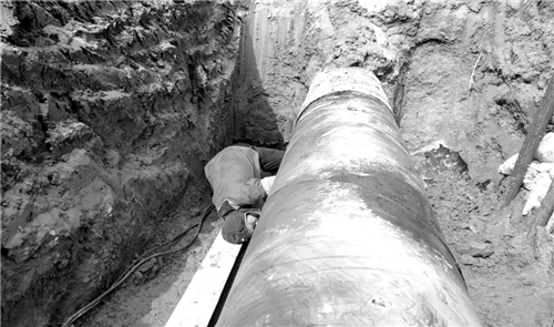 另外,為準確定位管道與河道平面的相對位置,首先用探管儀探測定位,其次在緊靠河堤兩側內的管道上開(kāi)挖兩個(gè)探坑,通過(guò)實(shí)際測量確定管道位置,確定管道缺陷腐蝕點(diǎn)修復作業(yè)坑開(kāi)挖位置。