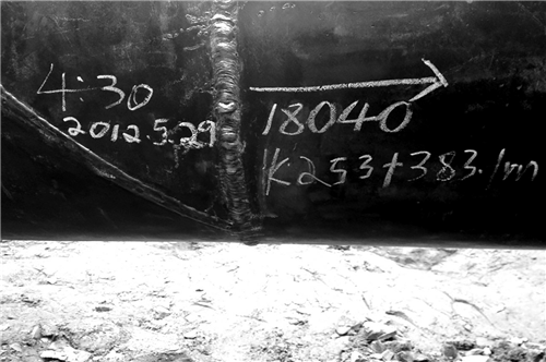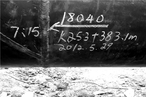 通過(guò)查找管道缺陷點(diǎn)附近的三道環(huán)焊縫與螺旋焊縫相交位置,都符合內檢測報告給定的數值。但是相應的管體表面卻沒(méi)有腐蝕缺陷點(diǎn)。為了確認腐蝕缺陷位置,現場(chǎng)從電腦中選取其它定位參考點(diǎn), 該管段原有套管且套管與輸油管道外壁存在支撐點(diǎn)(圖13),選取一個(gè)支撐點(diǎn),再次對腐蝕缺陷點(diǎn)進(jìn)行定位。且與原來(lái)內檢測報告給定的數值相吻合。