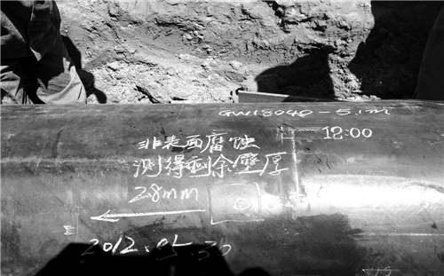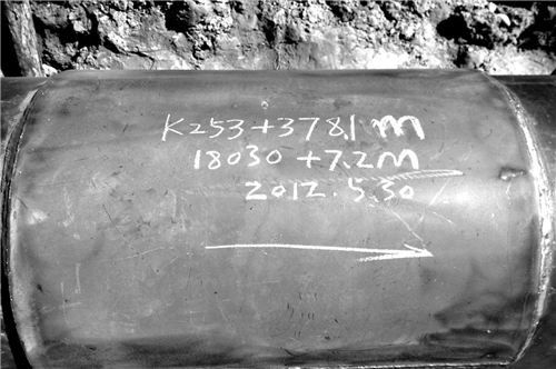 為了確認腐蝕點(diǎn),先向下游用氣焊切割套管軸向長(cháng)度5m、環(huán)向寬度0.3m,找到環(huán)焊縫后,確認焊縫的編號,重新界定腐蝕點(diǎn)位置。因下游沒(méi)有環(huán)焊縫按照以上工藝尋找上游環(huán)焊縫(圖12)。
