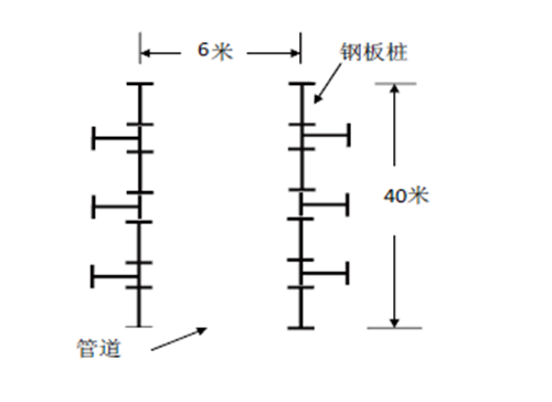 經(jīng)過(guò)測算,作業(yè)坑支護采用11m長(cháng)的32#b型工字鋼樁,沿管道兩側各打樁178根,每側鋼樁一正一反連續排放,兩側鋼樁間距6m(圖6)。
