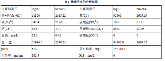 取站內平行儲罐內的罐下部含油污水,按照SY/T 5523-2006《油田水質(zhì)分析》,進(jìn)行水質(zhì)成分及其他理化指標分析,分析結果見(jiàn)下表。
