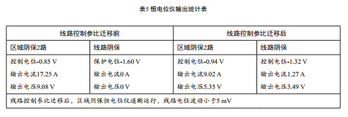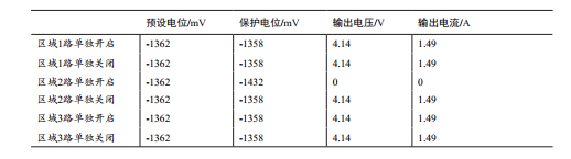 線(xiàn)路控制參比電極遷移前后,區域陰極保護系統恒電位儀及線(xiàn)路陰極保護系統恒電位儀輸出參數如下表: