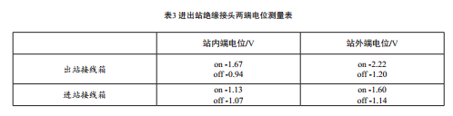 同時(shí)調整干線(xiàn)陰極保護系統恒電位儀的輸出,使得其輸出電流維持在未受干擾的水平,然后與區域陰極保護系統恒電位儀同步通斷,測得干線(xiàn)進(jìn)出站絕緣接頭兩端的電位如表3所示: