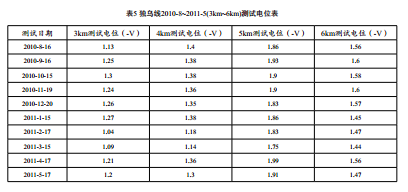 對獨烏線(xiàn)0-76km范圍內保護電位進(jìn)行分析,發(fā)現出站4km內,保護電位明顯過(guò)高,具體數據如表5所示。