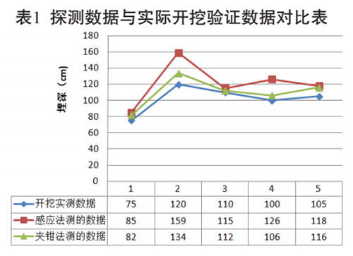 通過(guò)實(shí)際開(kāi)挖驗證,我們可以分析探測儀探測數據與實(shí)際埋深間的誤差。下面以武漢光纜支線(xiàn)中洲大橋段的5處測量點(diǎn)的數據進(jìn)行分析。如圖9、表1所示。
