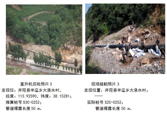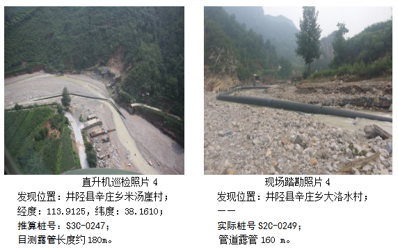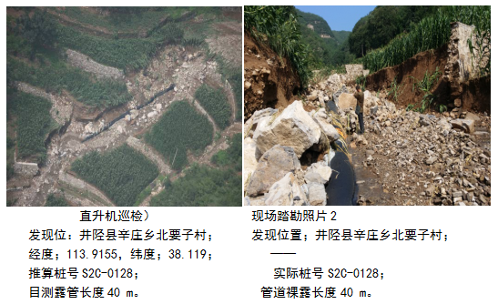 2016年7月19~20日,陜京天然氣管道(以下簡(jiǎn)稱(chēng)陜京管道)河北省井陘縣段出現連續強降雨天氣,24 h平均降雨量達到545.4 mm。小作河河水3 min內陡漲2 m多,剎那間兩岸變成一片汪洋。陜京管道與小作河河谷伴行敷設,洪水過(guò)后管道沿線(xiàn)道路全被沖毀,電力系統破壞嚴重,通信中斷。為了第一時(shí)間了解汛情過(guò)后的管道情況,7月22日9:30分,陜京管道5名員工乘坐直升機沿管道路由巡視飛行,12: 30分返回機場(chǎng),用時(shí)3 h,巡視管道線(xiàn)路約80 km,發(fā)現管道裸露或懸空14處。同時(shí),11名員工采用人工巡檢方式,于7月21~25日歷時(shí)5天對陜京管道進(jìn)行了徒步踏勘,對直升機巡視結果進(jìn)行了驗證,結果發(fā)現:
