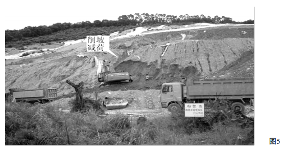 為了防止雨水對滑坡體裸露土層的沖刷, 造成滑坡的二次災害, 在現場(chǎng)搶險完畢后, 采用塑料薄膜進(jìn)行覆蓋保護。 在處理滑坡災害前, 現場(chǎng)工作人員需對滑坡體加強巡視檢查, 做好記錄。并組織對山體滑坡體進(jìn)行分層削去土層, 不斷減荷, 釋去滑坡體自重的重量, 消除滑坡危險后,對已開(kāi)挖管溝進(jìn)行埋土回填。 (見(jiàn)圖 5)