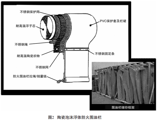 防火圍油欄用于水域控制溢油擴散和轉移,特別是溢油控制燃燒處理、 攔截、 防止火勢蔓延等作業(yè)中有著(zhù)不可替代的作用。 它由浮體、 裙體、 快速接頭三大部分組成, 浮體一般有不銹鋼浮體和陶瓷泡沫浮體, 具有阻燃防火功能; 裙體部分采用高強度PVC布縫制而成, 具有阻擋溢油從圍油欄下通過(guò)的作用; 快速接頭部分使圍油欄單體之間連接簡(jiǎn)捷、 迅速。 不銹鋼浮體防火圍油欄見(jiàn)圖1, 陶瓷泡沫浮體防火圍油欄結構見(jiàn)圖2。