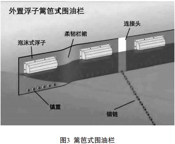 籬笆式圍油欄的主體為扁平結構(柔性欄裙) , 由泡沫式浮子、 柔性欄裙、 鎮重(讓圍油欄垂直在水中) 、 錨鏈和連接頭等部分組成, 結構見(jiàn)圖3。