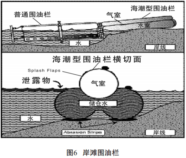 3. 岸灘圍油欄是一種特殊圍油欄, 它的干舷是充氣式的。 它的欄裙由兩個(gè)可充水的密閉水室組成, 使用時(shí)需要給水室充水。 岸灘圍油欄主要用于有潮汐的水域, 避免溢油在潮起潮落的轉換中逃逸。 岸灘圍油欄充水后重量大, 難以移動(dòng),一般可和普通圍油欄連接在一起使用。 落潮能裸露的區域使用岸灘圍油欄, 其余區域使用普通圍油欄, 見(jiàn)圖6。
