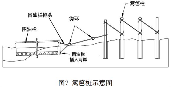 大的巖石、 樹(shù)或者人造的建筑(橋墩) 是理想的圍油欄岸邊固定點(diǎn), 其次是插入泥土中的鋼管、 籬笆柱等。 使用鋼管和籬笆柱時(shí), 需要多個(gè)合用, 與圍油欄的方向一致排列, 每個(gè)柱子之間使用繩子連接, 防止被圍油欄拖出, 見(jiàn)圖7。