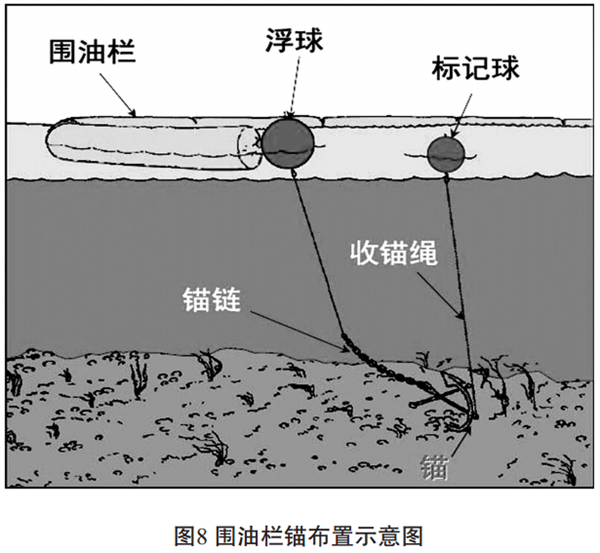 在河流中布放圍油欄, 為了確保圍油欄保持理想的角度, 需要使用錨來(lái)固定圍油欄, 見(jiàn)圖8。具體需要使用多少錨, 可以根據圍油欄的長(cháng)度、欄裙高度、 圍油欄和水流之間的相對速度及錨的種類(lèi)來(lái)計算。