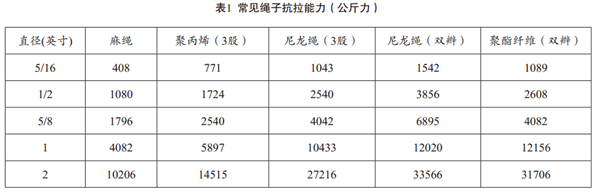 理想的圍油欄固定繩在拉力變化時(shí)長(cháng)度不會(huì )改變。 在激流中布放圍油欄時(shí), 選擇合適的固定繩非常重要。 聚丙烯繩會(huì )浮在水面, 這樣不容易受河床底部障礙物影響, 卻容易掛著(zhù)水面的垃圾; 合成纖維繩比金屬繩容易操作; 只有在不需調整位置的時(shí)候, 才使用金屬繩。 凱夫拉爾纖維(Kevlar) 繩和斯百克(Spectra, 一種超高分子量聚乙烯纖維) 繩也可以使用, 但是需要在容易磨損的地方安裝保護套。 圍油欄布放的環(huán)境不同, 需根據具體情況選擇最合適的固定繩, 也要根據圍油欄受力情況選擇固定繩, 使繩子抗拉能力達到需要的抗拉能力的2-4倍, 常見(jiàn)的繩子抗拉能力見(jiàn)表1。