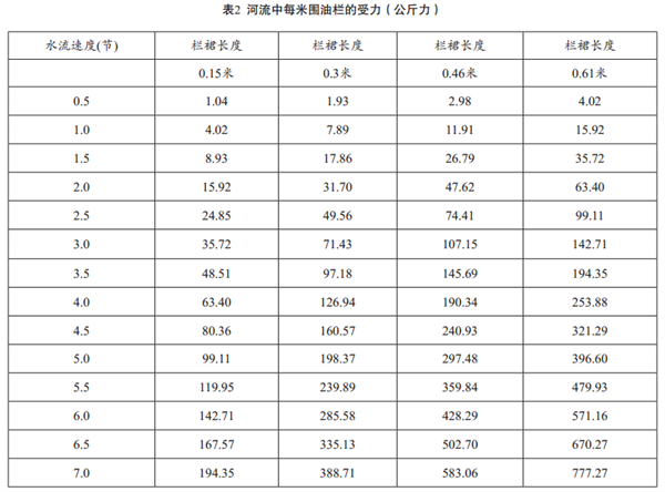 從上面計算公式可以看出, 水流對圍油欄的沖擊拉力很大, 我們應合理使用圍油欄。 不同水流速度下, 每米圍油欄受力情況見(jiàn)表2。