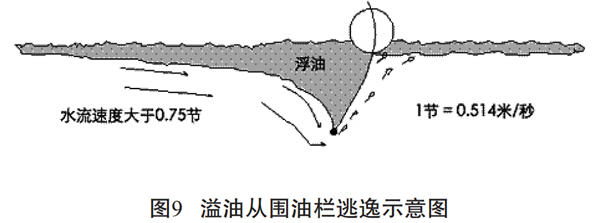 試驗表明, 所有的圍油欄無(wú)論欄裙長(cháng)短, 也不管浮子高低, 當圍油欄和水流之間的垂直相對速度大于0.75節時(shí), 溢油開(kāi)始從圍油欄底部逃逸見(jiàn)圖9。