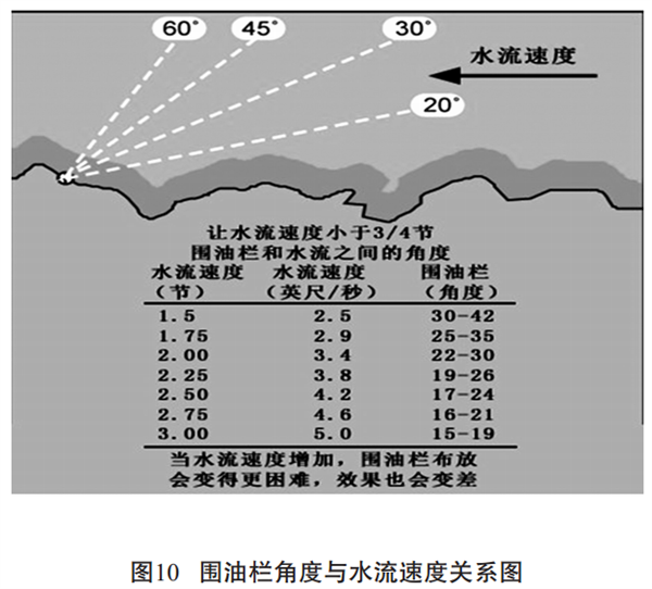 水流速度小于0.75節時(shí)圍油欄的布放當水流速度小于0.75節, 可使用圍油欄直接將河流攔截, 考慮圍油欄的長(cháng)度和收油機設置位置, 也可以設置圍油欄與河流流向成一定角度。水流速度大于0.75節且小于3節時(shí)圍油欄的布放在水流速度大于0.75節且小于3節的水域,可以通過(guò)使圍油欄和水流方向成一定角度(不垂直) , 來(lái)降低圍油欄和水流的垂直相對速度, 使得水流和圍油欄的垂直相對速度小于0.75節, 從而防止溢油從圍油欄底部逃逸。 圍油欄和水流之間的角度和水流速度有關(guān), 見(jiàn)圖10。