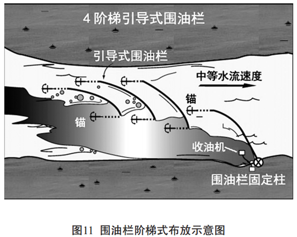 水流速度大于3節時(shí)圍油欄的布放當水流速度大于3節時(shí), 雖然我們可以通過(guò)使圍油欄和水流方向成較大的角度, 來(lái)降低水流對圍油欄的沖擊力, 但圍油欄仍然承受巨大的拉力。 此時(shí)需要采取圍油欄階梯式布放, 減少拉力。 即: 使用多組短圍油欄來(lái)引導溢油, 使之流到可以回收的區域進(jìn)行回收, 布放結構見(jiàn)圖11。