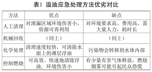 處理溢油事故的應急方法目前主要有4類(lèi),分別為人工清理、機械回收(圍堰、撇油、吸附等)、化學(xué)處理(輔助分散劑、破乳乳化、生物降解等)及現場(chǎng)控制燃燒,其適用條件及對環(huán)境的影響和處理成本相差很大。其中化學(xué)方法不但處理成本高,而且對周?chē)h(huán)境破壞非常嚴重,已被許多國家禁止使用;而人工清理和機械回收雖然不對環(huán)境造成二次傷害,但耗時(shí)長(cháng),處理成本高,不適用于快速處理環(huán)境敏感區溢油事故;現場(chǎng)控制燃燒因成本低、速度快,已在歐美等國家成功使用。通過(guò)對比得出,現場(chǎng)控制燃燒技術(shù)處理溢油事故速度快,對環(huán)境的傷害小,適合處理環(huán)境敏感區溢油事故(見(jiàn)表 1)。