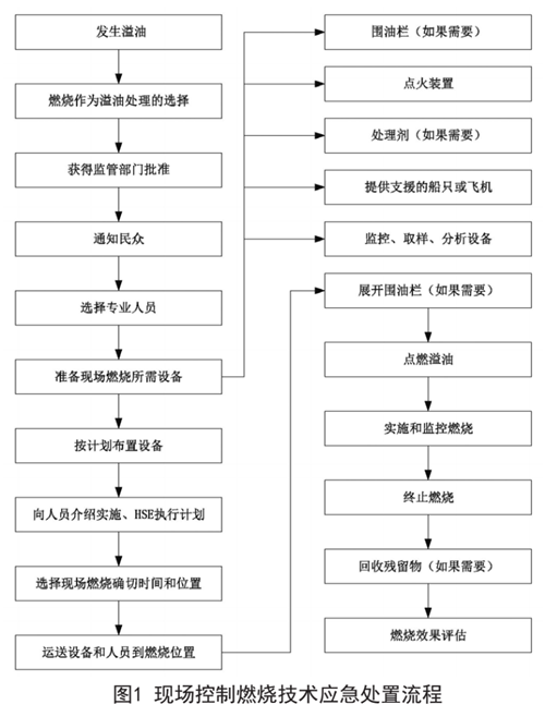 發(fā)生溢油事故后,應急響應指揮人員需要綜合考慮各種因素,比如溢油的面積、油品類(lèi)型和性質(zhì)、天氣條件;溢油的蔓延軌跡;評估其他供選擇的方案,如機械回收方法等;現場(chǎng)燃燒的可操作性,包括風(fēng)速、油品類(lèi)型、風(fēng)化、乳化、油膜厚度、現場(chǎng)能見(jiàn)度等;對環(huán)境可能造成的危害等。如果滿(mǎn)足實(shí)施現場(chǎng)控制燃燒的條件,還應征得國家和地方相關(guān)主管部門(mén)同意,才能按計劃實(shí)施,其處置流程如圖 1所示[4]。