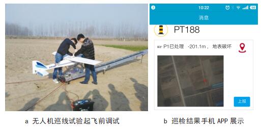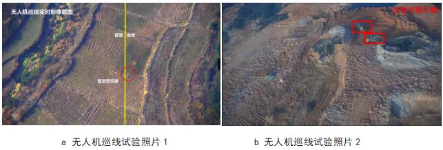 南昌上海支干線(xiàn)鷹潭至上饒段管道全長(cháng)70 km,全程GPS定點(diǎn)自主飛行。試驗選用固定翼電力驅動(dòng)無(wú)人機,垂直起降,正常航速約80 km/h,最大航程70 km。根據公司提出的技術(shù)需求,無(wú)人機服務(wù)公司研究開(kāi)發(fā)了自動(dòng)識別與預警軟件。試驗結果表明,無(wú)人機在400 m高空能夠發(fā)現管道沿線(xiàn)警示牌及其左右100 m范圍內挖掘機等影響管道安全的風(fēng)險因素,但地面人員處置配合項目未進(jìn)行聯(lián)合測試(見(jiàn)圖 2)。