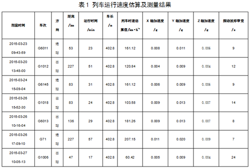 運行在武廣高鐵的是CRH2C型300 km/h速度等級動(dòng)車(chē),CRH2C型車(chē)是8節編組,中間車(chē)長(cháng)25.0 m,兩端的頭車(chē)長(cháng)25.7 m,列車(chē)總長(cháng)度為201.4 m。兩組動(dòng)車(chē)頭對頭重聯(lián)運行,共16節,總長(cháng)度為402.8 m。假設以振動(dòng)加速度傳感器安裝位置為觀(guān)測點(diǎn),振動(dòng)測試結果峰值帶寬時(shí)間就可以估算為整車(chē)通過(guò)觀(guān)測點(diǎn)的時(shí)間t。利用公式V=s/t計算列車(chē)運行速度,結果見(jiàn)表1。
