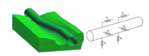 與管道交互作用的土體可以等效成三個(gè)維度的彈簧。如圖14所示,在管道的接點(diǎn)上分別連接軸向、水平和豎直方向的土彈簧,分別表示管道的軸向摩擦力、水平和豎直方向的壓力。其中KA、KH、KV分別表示三個(gè)方向彈簧的剛度系數。