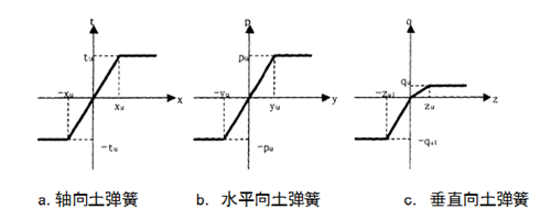 土彈簧的載荷與變形特性在一定變形區間內是線(xiàn)性關(guān)系,超出范圍的可以看成是塑性變形。另外,豎直方向的土彈簧拉伸和壓縮剛度系數并不相等。計算采用如圖15所示的彈簧模型。