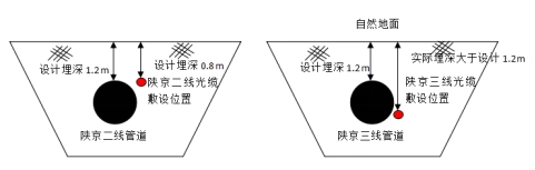 圖3 陜京二線(xiàn)管道(光纜)敷設埋深簡(jiǎn)圖 圖4 陜京三線(xiàn)管道(光纜)敷設埋深簡(jiǎn)圖