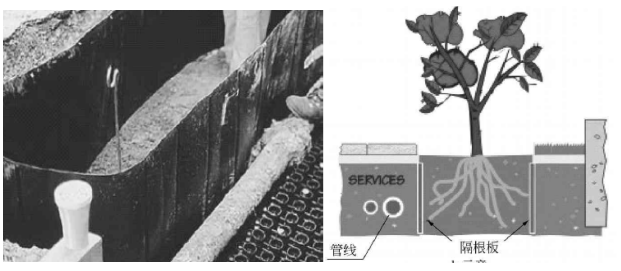 (3)危害等級評價(jià)為2級的樹(shù)種38種,這些植物根系主要表現為板根,側根發(fā)達,主根發(fā)達程度一般,根系生長(cháng)深度能夠達到管道埋深,但因根系強度較管材低,對管材本質(zhì)安全影響相對較小,主要危害防腐層和收縮套等。在條件允許的情況下,不應種植在管道周邊。如果不可避免種植這類(lèi)樹(shù)種,應在種植時(shí)安裝阻根板,以降低根系對管道的危害(見(jiàn)圖 4)。