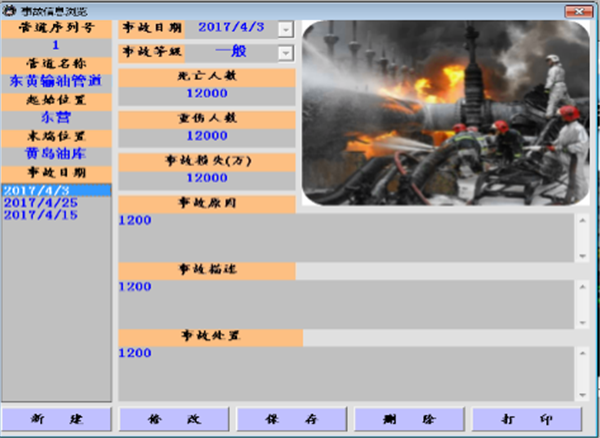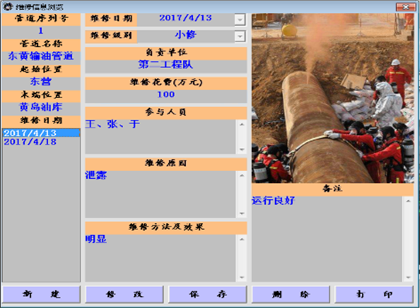 可方便地實(shí)現城市油氣管道主要性能參數的查閱、修改等功能,以管道為項目單位進(jìn)行管理,主要包括管道基本信息、運行狀態(tài)信息、維修信息、事故信息四部分。維修信息窗口如圖4所示,事故管理窗口如圖5所示。