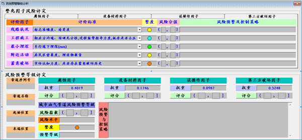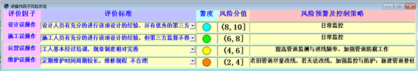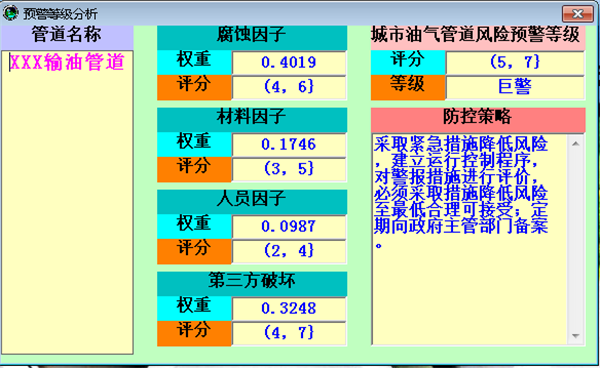 風(fēng)險評定之后,依據改進(jìn)的肯特(W.Kent)管道風(fēng)險評價(jià)方法( pipe risk management manual )[7],參考著(zhù)名油氣儲運專(zhuān)家潘家華教授提出的風(fēng)險模型,結合城市油氣管道風(fēng)險現狀,給出各風(fēng)險評定因子的權重分配,計算每個(gè)評定因子的評分錄入預警等級分析界面(如圖12所示),再計算出最終該管道的評分區間為[5,7],對照城市油氣管道相對風(fēng)險指數警度分級表得出預警等級為高風(fēng)險巨警,并給出相應的防控策略。
