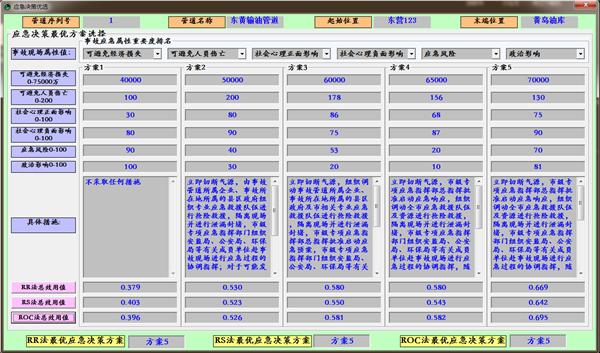 以某典型城市的天然氣管道為例,調研該城市天然氣管道風(fēng)險監測預警主要指標信息和管道本身信息,并基于該管道事故提出5種可行性的應急決策方案,準備完備所有相關(guān)資料,應用該系統進(jìn)行防控預警等級分析和應急方案決策優(yōu)選。
