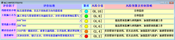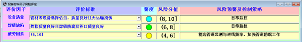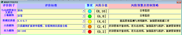 根據評價(jià)因子中所羅列的因素,在對應評價(jià)標準下拉菜單中選擇符合實(shí)際現場(chǎng)管道情況后,軟件自行判斷其對應的警度、風(fēng)險分值、風(fēng)險預警及控制策略,各評價(jià)因子的風(fēng)險評定結果如圖8—11所示。