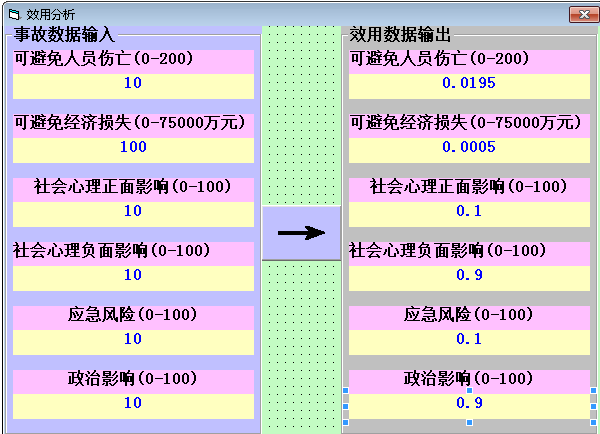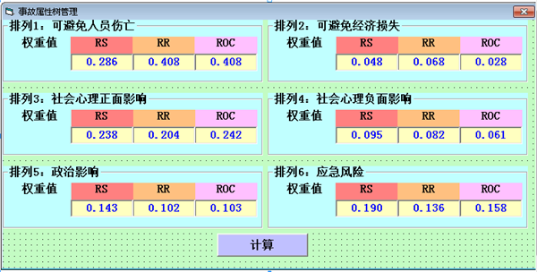 主要包括事故屬性值設定與屬性重要度排名區和應急方案總效用值計算區兩大部分,界面如圖7所示。