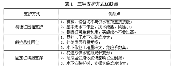 對已建管道的支護,主要有鋼板樁圍欄支護、斜拉式懸掛固定、固定樁橫擔支撐等方式(見(jiàn)表1)。
