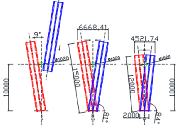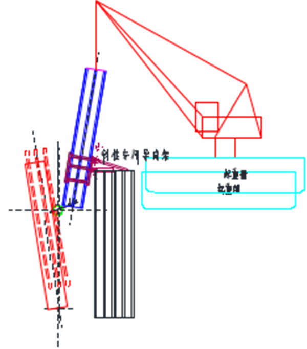 ①斜樁數據計算。通過(guò)計算和現場(chǎng)模擬實(shí)驗,確定斜樁長(cháng)15 m,2塊鋼板樁寬度,入泥10 m,斜樁9°入泥,樁體邊緣與水管線(xiàn)保持0.3 m安全距離。②斜樁導向架設計。為確保斜樁施工不發(fā)生偏移,在鋼圍檁上安裝斜樁導向架,角度可調。③斜樁夾緊裝置。斜樁按設計角度入泥后,水管線(xiàn)底部依然存在較大的空隙,為徹底封堵水管線(xiàn)底部,利用剪刀原理,夾緊兩側斜樁,封堵水管底部淤泥(見(jiàn)圖2、3、4)。