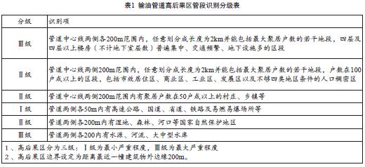 管段劃分以后,可按表1對每一管段內的高后果情況進(jìn)行分級識別,分級識別可以使設計人員進(jìn)行路由優(yōu)化時(shí)更加明白哪些位置是優(yōu)化的重點(diǎn)地段,進(jìn)而使設計優(yōu)化更加清晰。