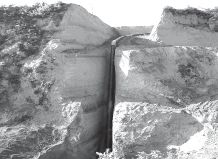 對西二線(xiàn)黃土塬地區多處大沖溝穿越段管道 進(jìn)行開(kāi)挖驗證,均發(fā)現管底出現不同程度的懸空現 象,懸空高度局部可達2m,懸空暴露處長(cháng)度已經(jīng) 達到10m左右。如果管底空穴進(jìn)一步擴大,達到管 道懸空最大限度后,管道將承受上方覆土造成的垂 直應力作用,威脅管道安全。