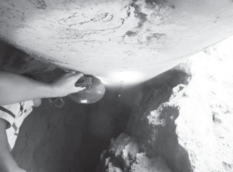 管道敷設時(shí)多采用大開(kāi)挖方式穿越黃土大沖 溝,由于黃土的濕陷性,結構破壞后,受降雨、農 田灌溉等因素影響極易造成管溝水土流失,出現陷 穴,當陷穴進(jìn)一步擴大形成貫通的潛蝕環(huán)境時(shí)管道 就會(huì )懸空。(圖3、4)