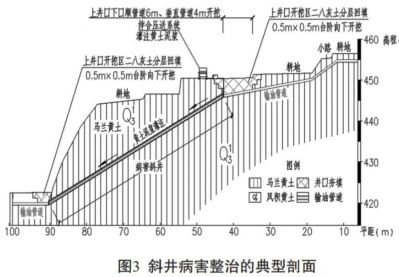 由于受黃土地區水文、 地質(zhì)和施工工藝等諸多因素的影響, 管道沿線(xiàn)的斜井工程不同程度的出現了病害, 可能導致管體發(fā)生彎曲或管體局部應力集中發(fā)生疲勞受損, 甚至可能發(fā)生斜井所在邊坡失穩, 嚴重威脅到輸油管道的安全營(yíng)運。