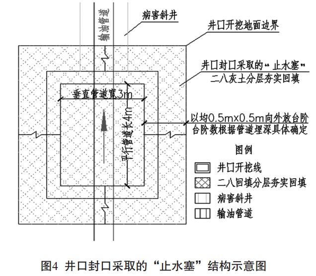 關(guān)鍵工序一: 斜井上、 下井口的開(kāi)挖按0.5m×0.5m臺階形式從地面向下開(kāi)挖, 使斜井井口下口順管道方向長(cháng)4m, 垂直管道方向長(cháng)3m。斜井井口地面開(kāi)挖尺寸根據管道具體埋深確定,開(kāi)挖深度至管底0.5m為準。 確保井口采用二八灰土分層夯填形成的“止水塞”能完全封堵斜井井口, 有效攔截地表水及順管溝的潛流。