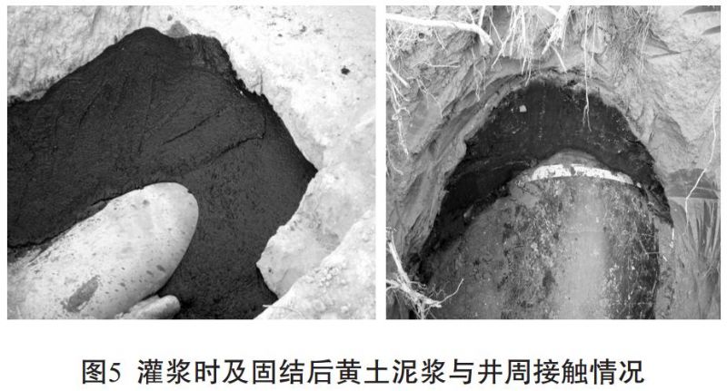 試點(diǎn)斜井施工完兩個(gè)月后挖開(kāi)試點(diǎn)斜井下井口檢查黃土泥漿與管道、 井壁黃土接觸情況, 發(fā)現斜井內部黃土泥漿充填密實(shí), 與四周的斜井井壁及管道均接合良好, 未發(fā)現有收縮縫存在, 同時(shí)泥漿并未完全固化, 略具彈性, 呈硬塑狀。 說(shuō)明黃土泥漿在斜井內部的固化時(shí)間相對較長(cháng)。 造成這種現象的原因主要是因為斜井內部空間為密封狀態(tài), 黃土泥漿在固結過(guò)程中析出的水分完全依靠斜井四周土體自然吸收, 當土體吸收的水分達到一定程度時(shí), 其吸水能力便會(huì )減弱, 同時(shí)密封空間內的溫度較低, 黃土泥漿的固化時(shí)間便進(jìn)一步延長(cháng)。 可以推測, 隨著(zhù)時(shí)間的增長(cháng), 管道周?chē)狞S土泥漿強度會(huì )逐漸增大, 管道的穩定性得到了極大的保證。