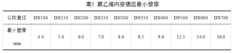 HDPE內襯管壁厚與原管道管徑成正相關(guān),按照計算經(jīng)驗公式和《采用聚乙烯內襯修復管道施工技術(shù)規范》(SY/T 4110-2007),與原管道不同管徑的HDPE內襯管壁厚見(jiàn)表1。