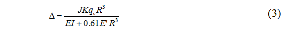 式中,Δ為管道水平徑向最大變形;J為管道變形滯后系數,宜取1.5;K為管道基座系數;R為管道半徑;E為管道彈性模量;I為單位長(cháng)度管壁截面慣性矩;E′為地基系數。