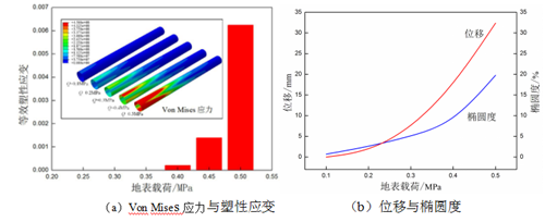 圖4(b)中,隨著(zhù)地表載荷增大,管道沉降量逐漸增大。當地表載荷小于0.2 MPa時(shí),管道最大沉降量?jì)H為1.3 mm。管道最危險截面橢圓度隨著(zhù)地表載荷的增大而增大,當地表載荷小于0.4 MPa時(shí),管道僅發(fā)生彈性變形,且橢圓度變化率非常小。當進(jìn)入非彈性階段后,管道橢圓度較大且出現塑性變形。此時(shí),管道承載能力急劇降低,不利于清管工作,且易出現裂紋[7]。